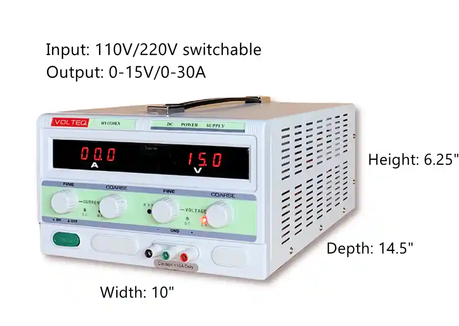 VOLTEQ HY1530EX is a high current regulated DC power supply with built-in over-voltage and over-current protection, ideal for battery charging and equalizing, DC motors, anodizing and plating applications. HY1530EX has the maximum DC power of 450W. This high quality regulated power supply can be continuously adjustable at 0-15V DC and 0-30A. The unit comes with 2 LED displays, providing accurate and clearly visible readout for the voltage and current value. This unit has toggle switch at the back that allows you to operate it in 110V AC or 220V AC. Retails over $400.